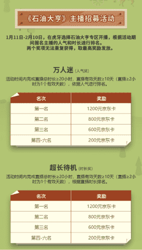除了“油王”争霸赛,,精英主播招募活动亦同步开启!!!!赛事分时长奖和人气奖,,,,奖励同样丰厚!!!